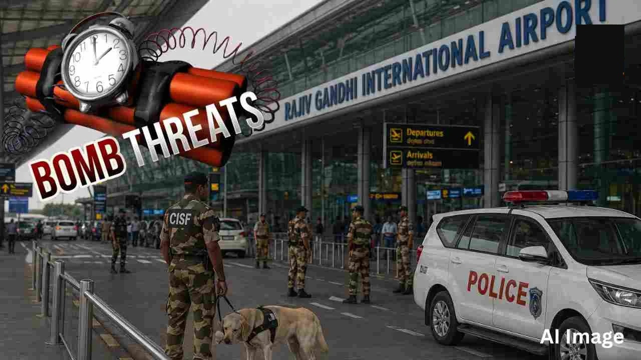અહીંના રાજીવ ગાંધી આંતરરાષ્ટ્રીય વિમાન મથકે આજે સવારે અફડાતફડીનો માહોલ છવાઈ ગયો હતો. જયારે બોમ્બની ધમકીનો ઈ-મેલ આવ્યો હતો. આ ધમકી બાદ પુરા એરપોર્ટ પરિસરમાં સુરક્ષા વ્યવસ્થાને કડક બનાવી દેવામાં આવી હતી.