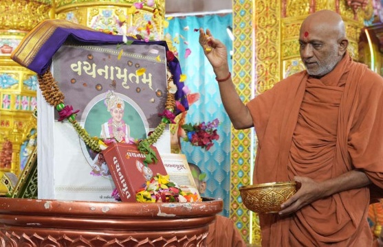 ભગવાનની વાણી તે ભગવાનનું સ્વરૂપ છે એ ગ્રંથરાજ વચનામૃતના જ 108 નામ મંત્રોના ગાન સાથે  પુષ્પ પાંખડી , વસ્ત્ર, નૈવેદ્ય અર્પણ કરી આરતી ઉતારવામાં આવેલ.