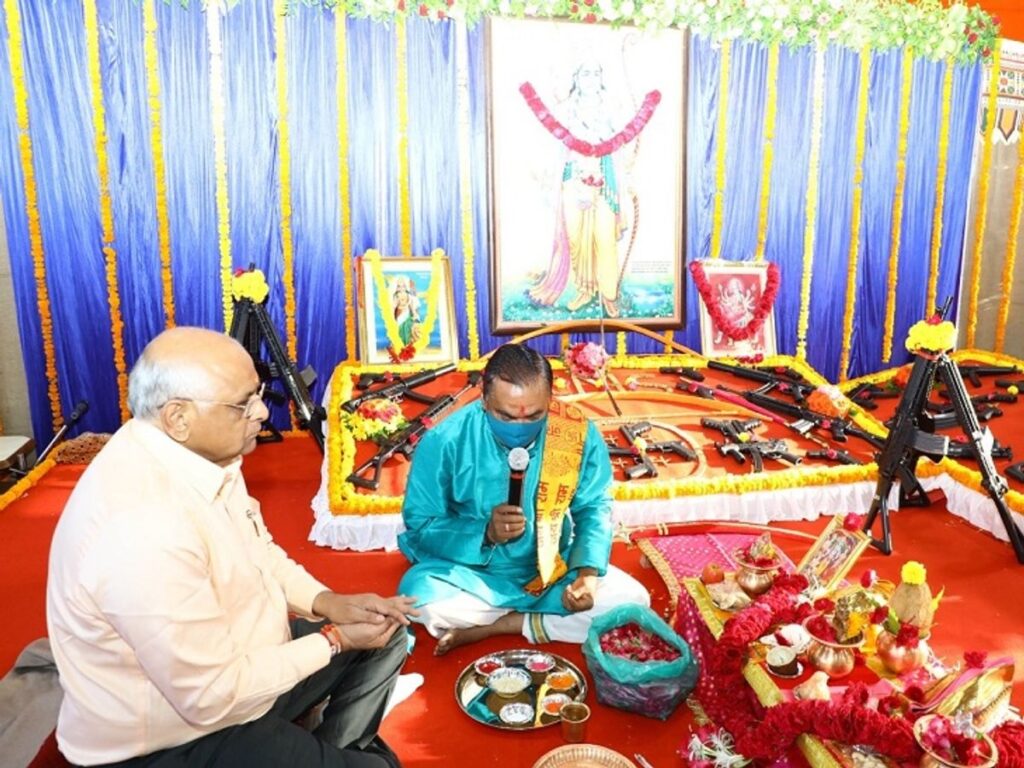 સુરક્ષા કર્મીઓએ પણ રાષ્ટ્ર-રાજ્ય અને સમાજની રક્ષા-સુરક્ષા માટે સમર્પિત ભાવ સાથે કર્તવ્યરત રહેવાનું છે તેની વિભાવના મુખ્યમંત્રીએ કર્મના સિદ્ધાંતોને અનુરૂપ ઉદાહરણોથી સમજાવી હતી.મુખ્યમંત્રીના સલામતી પોલીસ અધિક્ષક તેજસ પટેલ, નાયબ પોલીસ અધિક્ષકો, પોલીસ ઇન્સ્પેકટર્સ તથા પી.એસ.આઇ અને કમાન્ડોઝ આ શસ્ત્ર પૂજામાં સહભાગી થયા હતા.