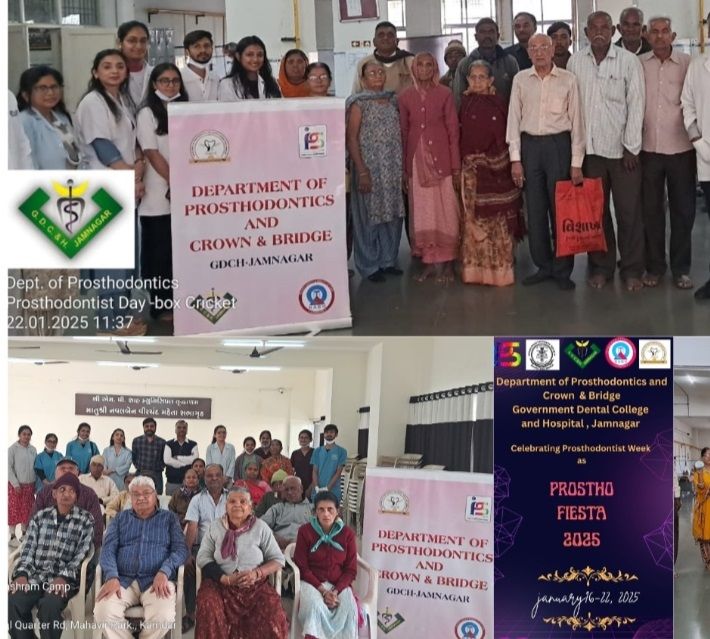 જામનગરમાં આવેલ ગર્વમેન્ટ ડેન્ટલ હોસ્પિટલના પ્રોસ્થોડોન્ટીકસ વિભાગ દ્વારા ૨૨ જાન્યુઆરી પ્રોસ્થોડોન્ટીકસ ડે ની ઉજવણી અંતર્ગત ૧૬ જાન્યુઆરી થી ૨૨ જાન્યુઆરી સુધી PROSTHO FIESTA સપ્તાહની ઉજવણી કરવામાં આવી હતી. આ સપ્તાહ દરમિયાન વિવિધ રસપ્રદ પ્રવુતિઓનું આયોજન કરવામાં આવ્યું હતું. જેમાં પતંગ ડિઝાઈનીગ ,કાવ્યરચના ,રીલ્સ ,કચુટ ક્વીઝ, ગેમ ,બ્રોકસ ક્રિકેટ ,રંગોલી સ્પર્ધા ,શાકભાજી અને ફળો વડે દંત ક્રાફ્ટ જેવી રચનાત્મક પ્રવુતિઓ સાથે દર્દી જાગૃતતા કાર્યક્રમો અને કેમ્પનું પણ આયોજન કરવામાં આવ્યું હતું. આ ઉજવણી અંતર્ગત એમ. પી. શાહ વૃધ્ધાશ્રમના દર્દીઓને સારવાર આપવામાં આવી હતી.આ સમગ્ર કાર્યક્રમ ડેન્ટલ પ્રોસ્થોડોન્ટીકસ વિભાગના વડા ડો. સંજય લગદિવે, સિનીયર મોસ્ટ ડો. સંજય ઉમરાણીયા, સમગ્ર પ્રોસ્થોડોન્ટીકસ વિભાગ ટીમ અને ડેન્ટલ હોસ્પિટલના ડીન ડો. નયનાબેન પટેલના માર્ગદર્શન હેઠળ સફળતાપૂર્વક સંપન્ન થયો હતો. જેમાં વિદ્યાર્થીઓ અને ડેન્ટલ કોલેજનો સ્ટાફ સહભાગી થયો હતો.