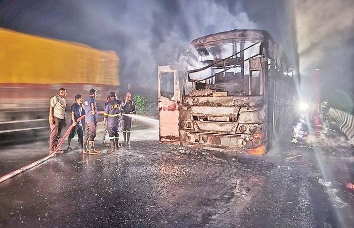 ધોળકામાં શિવ લહેરી ટ્રાવેલ્સ ધરાવતી કંપનીના માલિક દિનેશભાઈ ઠાકોર દ્વારા બાવળા દેથલથી પાવાગઢ દર્શન માટે ખાસ પ્રવાસની ટ્રીપનું આયોજન કરવામાં આવ્યું હતું. બસમાં ૫૬ મુસાફરોને બેસાડવામાં આવ્યા હતા. આવવા જવાનું અંતર ૪૫૦ કિલોમીટર જેટલું થતું હોવાથી જમવાની નાસ્તાની વ્યવસ્થા પણ રખાઈ હોવાથી બસમાં ભોજનનો સામાન તથા ગેસનો બાટલો પણ રાખવામાં આવ્યો હતો. મંગળવારની મધ્યરાત્રિના ૧૨.૨૦ કલાકે આણંદ પાસે આવેલા ભૂમેલ બ્રિજ નજીક પાવાગઢ તરફથી આવતી લક્ઝરી બસમાં ડ્રાઈવરની કેબિનમાંથી ધૂમાડા નીકળતા શંકા જતા ડ્રાઈવરે બસને સાઈડમાં ઉભી કરી દીધી હતી. બસમાં ઊંઘી રહેલા તમામ મુસાફરોને ડ્રાઈવર અને ક્લીનરે ત્વરિત ઉતારી જાનહાનિ ના થાય માટે દૂર ઉભા રખાયા હતા. થોડી જ વારમાં લક્ઝરી બસ ભડભડ સળગી ઉઠી હતી. આગની ઘટનાથી રસ્તે જતા વાહન ચાલકો પણ ભયભિત થઈ ગયા હતા. કરમસદ આણંદ ફાયરબ્રિગેડની ગીમે આવી તાત્કાલિક આગ બુઝાવવામાં આી હતી. બસની કેબિનમાં શોર્ટસર્કિટ થવાથી આગળનો ભાગ બળીને ખાક થઈ ગયો હતો. ડ્રાઈવરની સમય સૂચકતાને કારણે તમામ મુસાફરોનો જીવ બચી ગયો હતો. બીજી બસની વ્યવસ્થા કરી મુસાફરોને સુરક્ષિત રવાના કરાયા હતા. પાવાગઢથી દર્શન કરીને બાવળા દેથલ પરત આવતા આ ઘટના સર્જાઈ હતી. આયોજક અને ટ્રાવેલ્સ કંપનીના માલિક દિનેશ ઠાકોરે વડતાલ પોલીસ મથકમાં આગની ઘટના અંગે ફરિયાદ નોંધાવી છે.