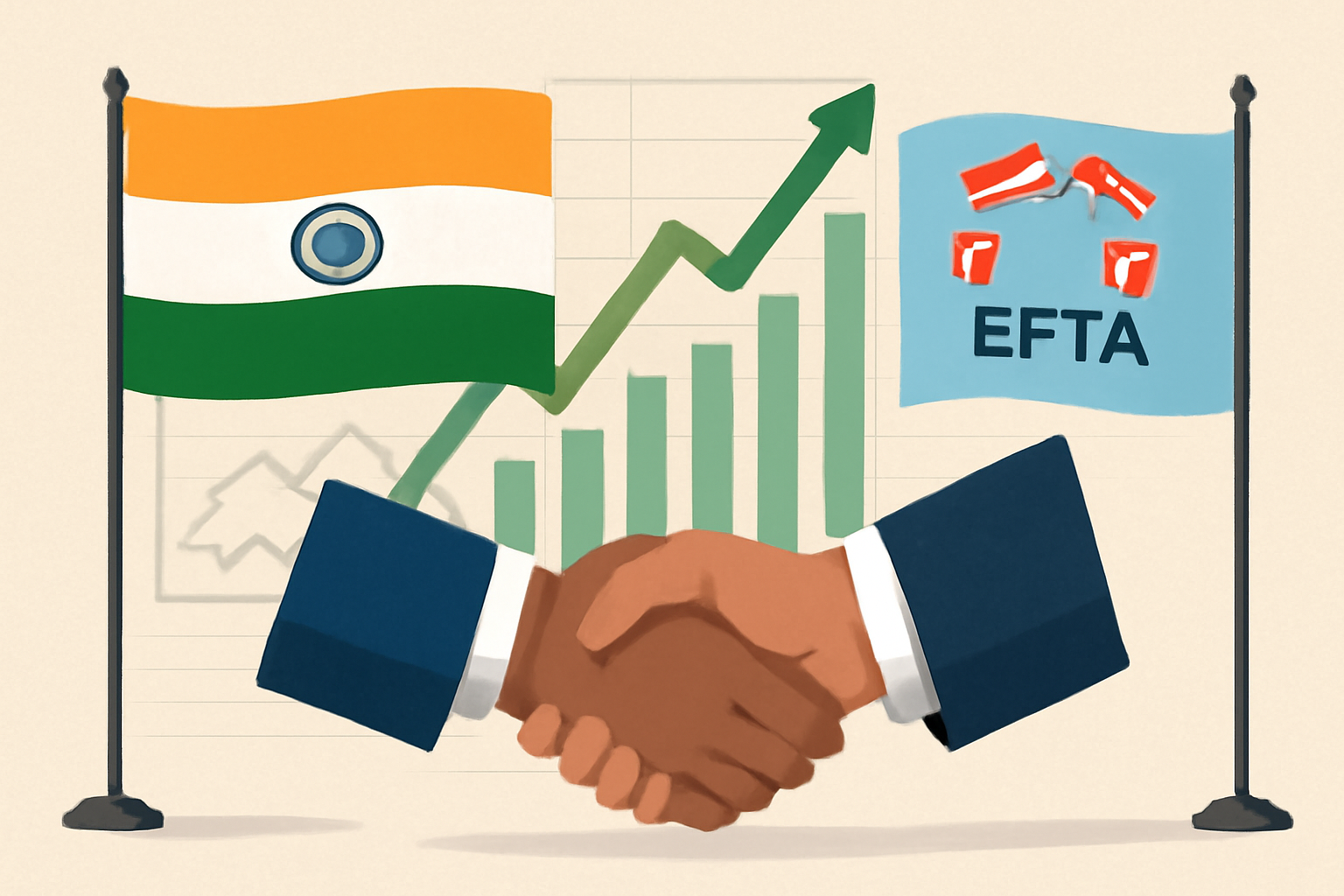 ભારત અને યુરોપિયન ફ્રી ટ્રેડ એસોસિએશન (EFTA) વચ્ચેનો વેપાર કરાર આખરે ૧ ઓક્ટોબરથી અમલમાં આવશે. લગભગ દોઢ વર્ષથી ચાલી રહેલી પ્રક્રિયાગત વિલંબ બાદ આ કરાર અમલમાં આવી રહ્યો છે. ભારત અને EFTA દેશો વચ્ચે ૧૦ માર્ચ, ૨૦૨૪ના રોજ આ કરાર પર હસ્તાક્ષર થયા હતા. EFTA બ્લોકમાં આઇસલેન્ડ, સ્વિટ્ઝર્લૅન્ડ, નોર્વે અને લિક્ટેંસ્ટેઇનનો સમાવેશ થાય છે. આ કરારને “વેપાર અને આર્થિક ભાગીદારી કરાર” નામ આપવામાં આવ્યું છે, જે ભારતના કોઈપણ યુરોપિયન દેશ અથવા બ્લોક સાથેનો પ્રથમ અમલમાં મુકાયેલો વેપાર કરાર છે.