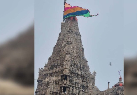 પશ્ચિમ ભારતના મહત્વના તીર્થસ્થાન દ્વારકાના ભવ્ય જગતમંદિરના શિખર પર ગઈકાલે સોમવારે ધ્વજા અડધી કાઠીએ લહેરાવાઈ હતી. કારણ કે ગઈકાલે સવારથી મોસમે મિજાજ બદલ્યો હતો અને વહેલી સવારથી વરસાદી વાતાવરણ છવાયું હતું.