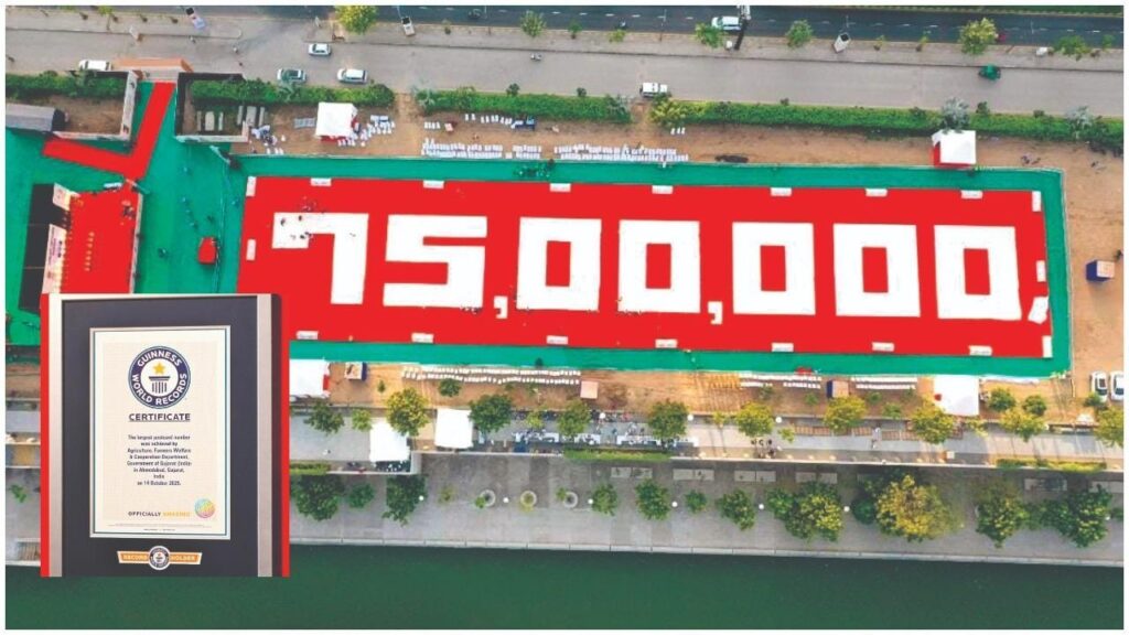 અમદાવાદના રિવરફ્રન્ટ ખાતે 350 બાય 80 ફુટના વિસ્તારમાં 75 લાખનો આંકડો બનાવીને એમાં પોસ્ટકાર્ડ્સ લગાવવામાં આવ્યાં હતાં. આ કામગીરી માટે સહકાર વિભાગના પચાસથી વધુ અધિકારીઓ અને 100થી વધુ કર્મચારીઓએ સતત 4 દિવસ સુધી જહેમત ઉઠાવી હતી.’