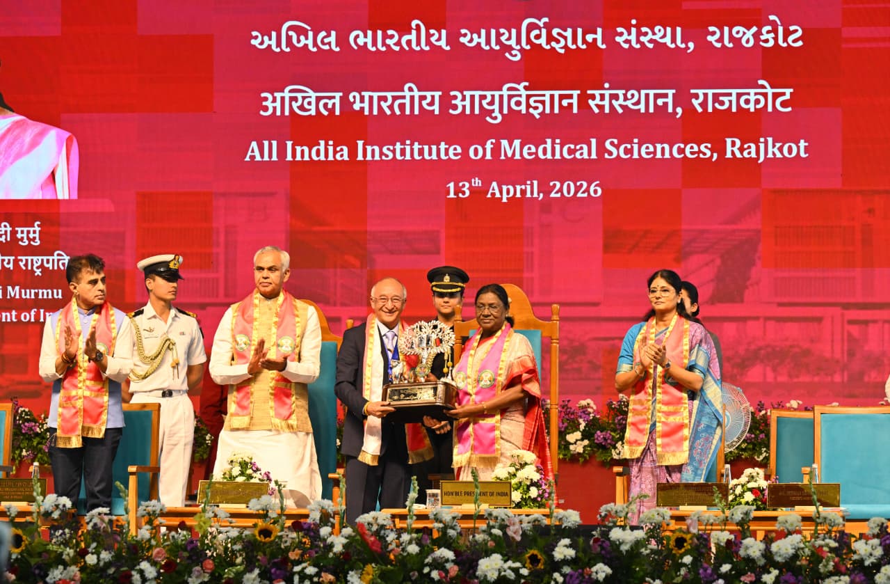 કુશળ અને સામાજિક રીતે સભાન ડોક્ટરો સમાજમાં ગહન પરિવર્તન લાવવાની શક્તિ ધરાવે છે: રાષ્ટ્રપતિ દ્રૌપદી મુર્મુભારતના રાષ્ટ્રપતિ શ્રીમતી દ્રૌપદી મુર્મુ આજે (13 એપ્રિલ, 2026) ગુજરાતના રાજકોટ ખાતે એઈમ્સ (AIIMS) રાજકોટના પ્રથમ પદવીદાન સમારોહમાં ઉપસ્થિત રહ્યા અને સંબોધન કર્યું હતું.