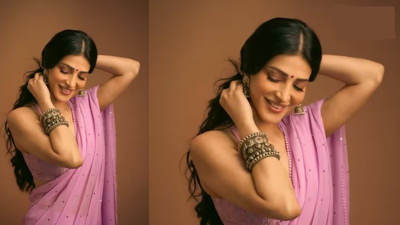અભિનેત્રી શ્રુતિ હાસન વારંવાર તેના લુક માટે હેડલાઇન્સમાં રહે છે. તાજેતરમાં, અભિનેત્રીએ ફરી એકવાર તેના પરંપરાગત અવતારથી બધાનું ધ્યાન ખેંચ્યું. શ્રુતિએ ગુલાબી સાડીમાં પોતાની અદભુત તસવીરો શેર કરી, જે હવે સોશિયલ મીડિયા પર વાયરલ થઈ રહી છે. શ્રૃતિ પોતાના સોશિયલ મીડિયા પર ખૂબ એક્ટિવ છે. એક્ટ્રેસે તાજેતરમાં સાડી લૂક ધરાવતી કેટલીક તસવીર સોશિયલ મીડિયામાં પોસ્ટ કરી હતી.આ ફોટોમાં શ્રૃતિ પિંક સાડીમાં જોવા મળી રહી છે. સાડીમાં પણ તેણે મનમોહક પોઝ આપ્યા હતા. પિંક સાડી સાથે તેમણે મસ્ત પ્રાચીન જ્વેલરી પહેરી છે. પોતાનો લૂક કંપ્લિટ કરવા માટે તેણે માથા પર મરૂન રંગનો ચાંદલો કર્યો હતો. ખાસ વાત તો એ છે કે, આ લૂકમાં તેમણે ખૂબ ઓછો મેકઅપ કર્યો છે.તમામ ફોટોમાં તેનો સિમ્પલ લૂક દેખાઈ રહ્યો છે. સામાન્ય રીતે કોઈપણ ફોટોશૂટમાં એક્ટ્રેસ એક અલગ મેકઅપ કરતી હોય છે. શ્રૃતિ ઓછામાં ઓછો મેકઅપ કરીને ફેન્સને ચોંકાવી દીધા હતા.સાડીમાં પણ એના એકથી એક ચડિયાતા પોઝા આપ્યા હતા. દરેક ફોટોમાં એની નેચરલ બ્યૂટી જોવા મળી હતી. શ્રૃતિની આ તસવીરને ફેન્સ જોરશોરથી વાયરલ કરી રહ્યા છે. સાદગીભર્યો અંદાજ જોવા મળતા ફેન્સે કોમેન્ટનો વરસાદ કર્યો હતો. એક ફેન્સે તે એવી કોમેન્ટ કરી દીધી હતી કે, આય..હાય…લાજવાબ. એક યુઝર્સે લખ્યું હતું કે, શ્રૃતિનો જવાબ નથી. એક યુઝરે તો માત્ર કિસ વાળું ઈમોજી મૂકીને કોમન્ટ કરી હતી. હકીકત એ પણ છે કે, શ્રૃતિ સાડી લૂકમાં પણ મસ્ત લાગી રહી છે. જ્યારે ગર્લ્સ આને પર્ફેક્ટ સાડી ફોર પાર્ટી માની રહી છે. વી નેન્કું બ્લાઉઝ અને સાડીને પર્ફેક્ટ પહેરીને શ્રૃતિએ ફોટો ક્લિક કરાવ્યા હતા. શ્રૃતિ કોલ મી બે નામની વેબસીરિઝમાં જોવા મળશે. આ સીરિઝમાં તે અનન્યા સાથે સ્ક્રિન શેર કરી રહી છે. આ વેબસીરિઝનું શુટિંગ થાઈલેન્ડમાં શરૂ થયું છે. સંપૂર્ણ સ્ક્રિપ્ટ ફાઈનલ થયા બાદ શ્રૃતિએ આ સીરિઝ કરવાની તૈયારીઓ બતાવી હતી. જોકે, કોલ મી બે વેબસીરિઝની આ બીજી સીઝન છે. આ સીરિઝનું શુટિંગ ફુકેટ આઈલેન્ડ પર થઈ રહ્યું છે. જોકે, આ વખતે સીરિઝ કઈ થઈ થીમ પર છે એ જાહેર થયું નથી. એ વાત નક્કી છે કે, શ્રૃતિ આ સીરિઝમાં એક નવા અવતારમાં જોવા મળશે.
