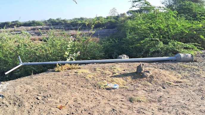અમરેલીનાં પાદરમાં આવેલ ઠેબી જળાશય નજીક થોડા મહિનાઓ પહેલા જનતાનાં પરસેવાનાં પૈસાથી સિંચાઈ વિભાગ ઘ્વા રા વીજપોલ ઉભો કરવામાં આવ્યોે અને થોડા જ દિવસોમાં વીજપોલ જમીનદોસ્ત  થઈ ગયો અને છતાં સિંચાઈ વિભાગનાં અધિકારીઓને વીજપોલને ઉભો કરીને કાર્યરત કરવાની કોઈ જરૂર લાગતી નથી તેવું માનવું રહ્યું.