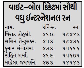 સચિન તેન્ડુલકરે પોતાની ઇન્ટરનેશનલ કરીઅરમાં 452 વન-ડે ઇનિંગ્સમાં 18,426 રન અને એક T20 ઇનિંગ્સમાં 10 રન સાથે વાઇટ-બોલ ક્રિકેટમાં 18,436 રન કર્યા છે, જ્યારે વિરાટ કોહલીએ 410 ઇન્ટરનેશનલ વાઇટ-બોલ ક્રિકેટ-ઇનિંગ્સમાં 18,443 રન કરીને માસ્ટર બ્લાસ્ટરનો 12 વર્ષ જૂનો મહારેકોર્ડ તોડયો છે.